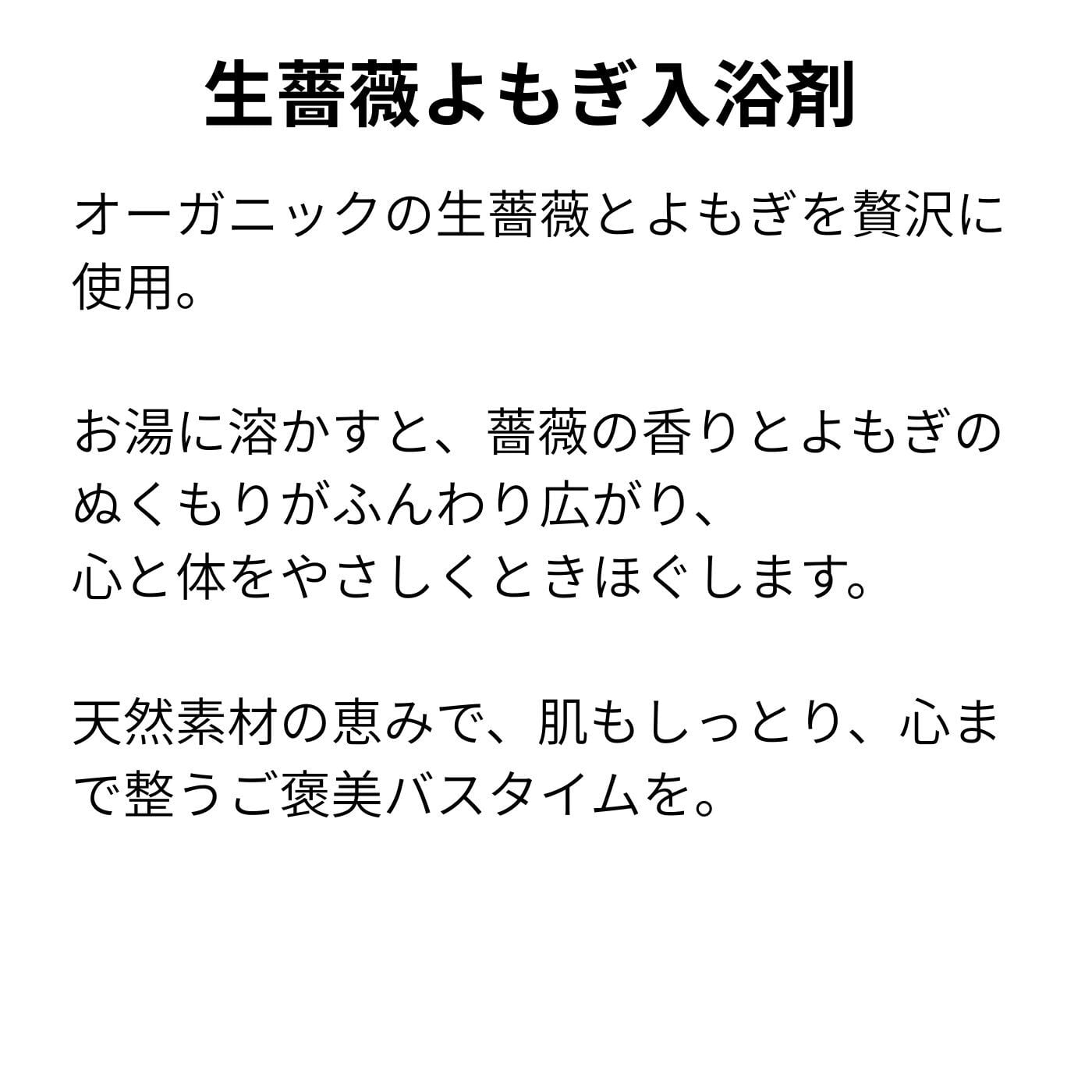 オーガニックの生薔薇とよもぎをたっぷりと使用した、自然派入浴剤です。お湯に溶かした瞬間、ふんわりと広がる薔薇の香りとよもぎのぬくもりが、まるで自然の中で深呼吸しているような安らぎをもたらします。